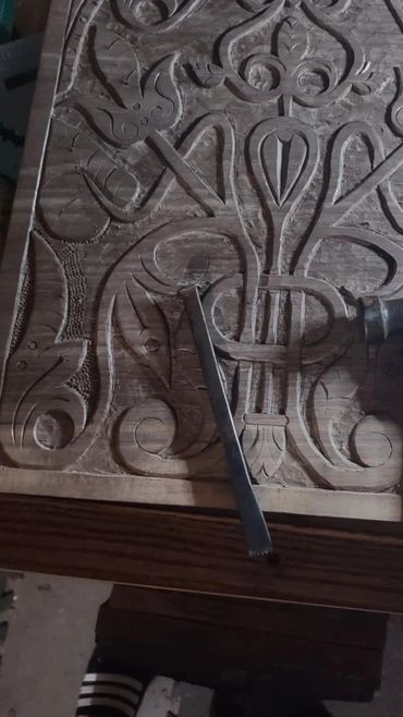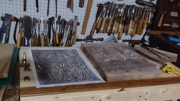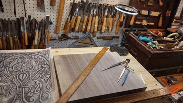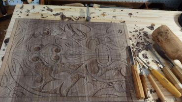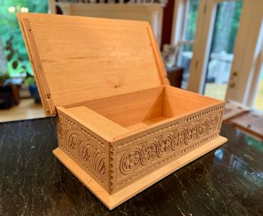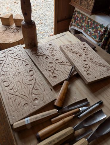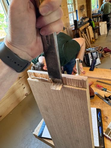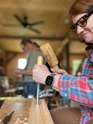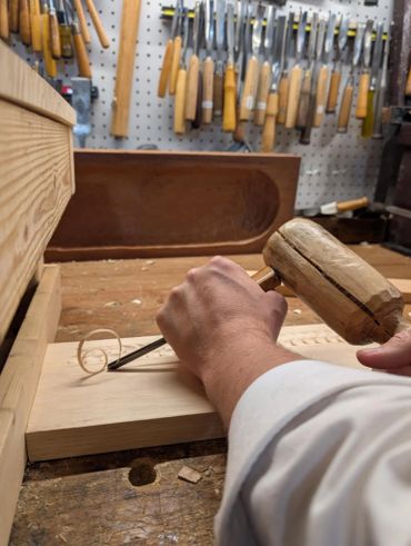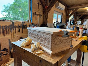 The photos below show Rick and Anne Marie using traditional techniques and hand tools to create a 17th century desk box. These boxes played a major role in the lives of people living in Connecticut and Massachusetts in the 17th century. They were traditionally made out of oak and pine and were elaborately carved. Rick is a guest instructor at the Eric Sloane Museum.
